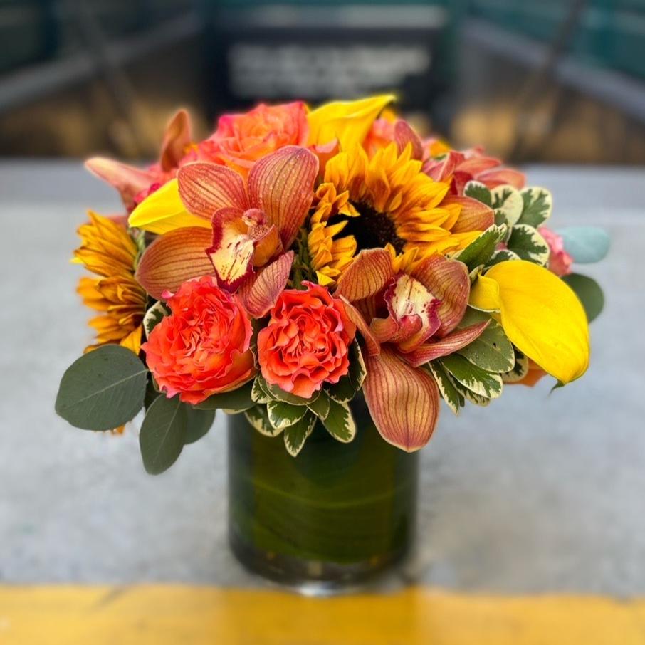 A bright arrangement with a warm palette of oranges and yellows, with seasonal flowers such as sunflowers, roses, calla lilies and cymbidium orchids.