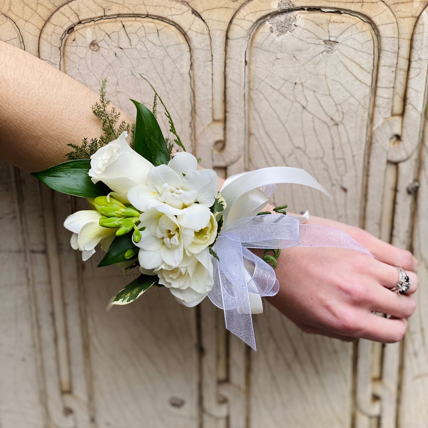 An elegant wrist corsage designed with roses and accenting flowers such as freesia and spray roses for a lush look, featuring satin ribbon and accenting greenery. Call us for special requests: 212-346-0756. *PLEASE NOTE: Our minimum order amount is $75. If your order does not meet the minimum, you may choose the pick up option at either of our locations.