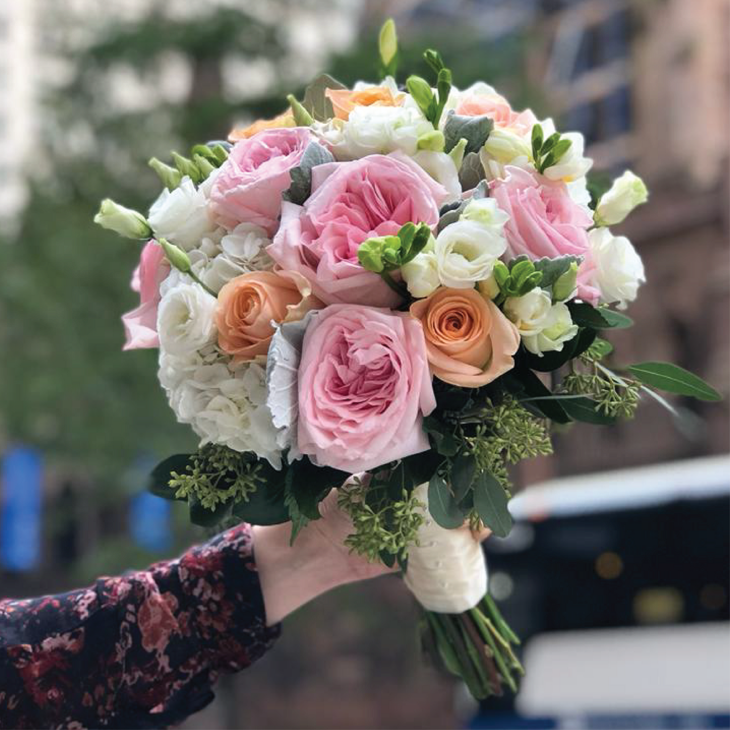 A lush bouquet designed in hues of peach, cream, white and blush hand-tied with a selection of seasonal blooms such as Roses, Spray Roses, Freesia and Lisianthus with a touch of accenting greenery. The stems are artfully wrapped with a double-satin Ivory ribbon for a luxurious finish.