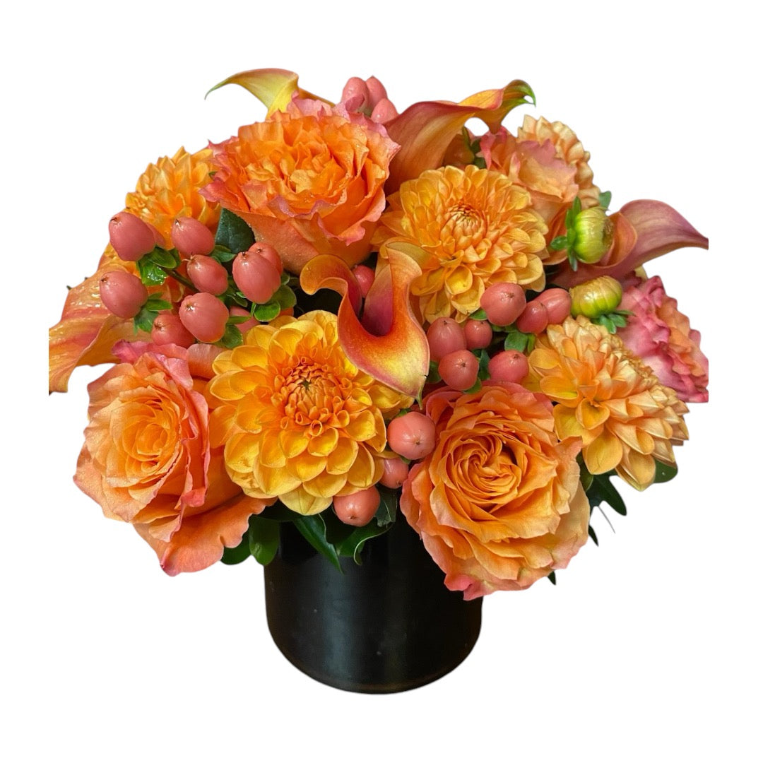 Add some spice to your Thanksgiving table with this beautiful seasonal arrangement designed in warm Fall hues of orange, with flowers such as orange free spirit roses, hypericum berries, dahlias, calla lilies and accented with greenery. Perfect for a fall gift or a thanksgiving centerpiece.