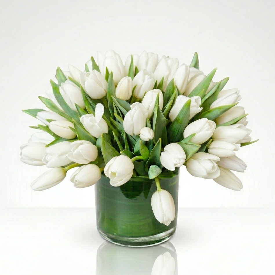 A stunning bouquet of tulips perfectly arranged in a clear glass leaf lined vase. Choose from mixed colored, pink, red, or white bunches.