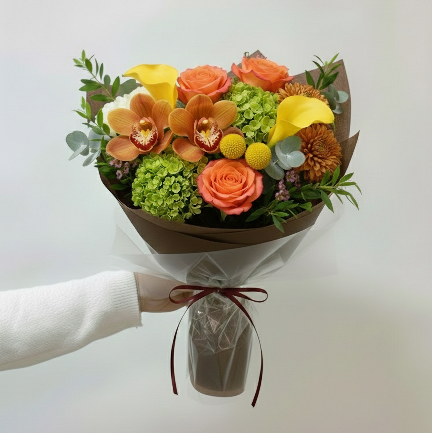 A hand-tied bouquet featuring the freshest seasonal blooms in warm shades of orange and yellow. Each bouquet is uniquely designed by our florists using the best flowers available, so no two will look exactly the same. We will stay within this rich, autumnal color palette while highlighting what is most beautiful and in season—perfect for fall gifting, celebrations, or a cozy just-because moment.