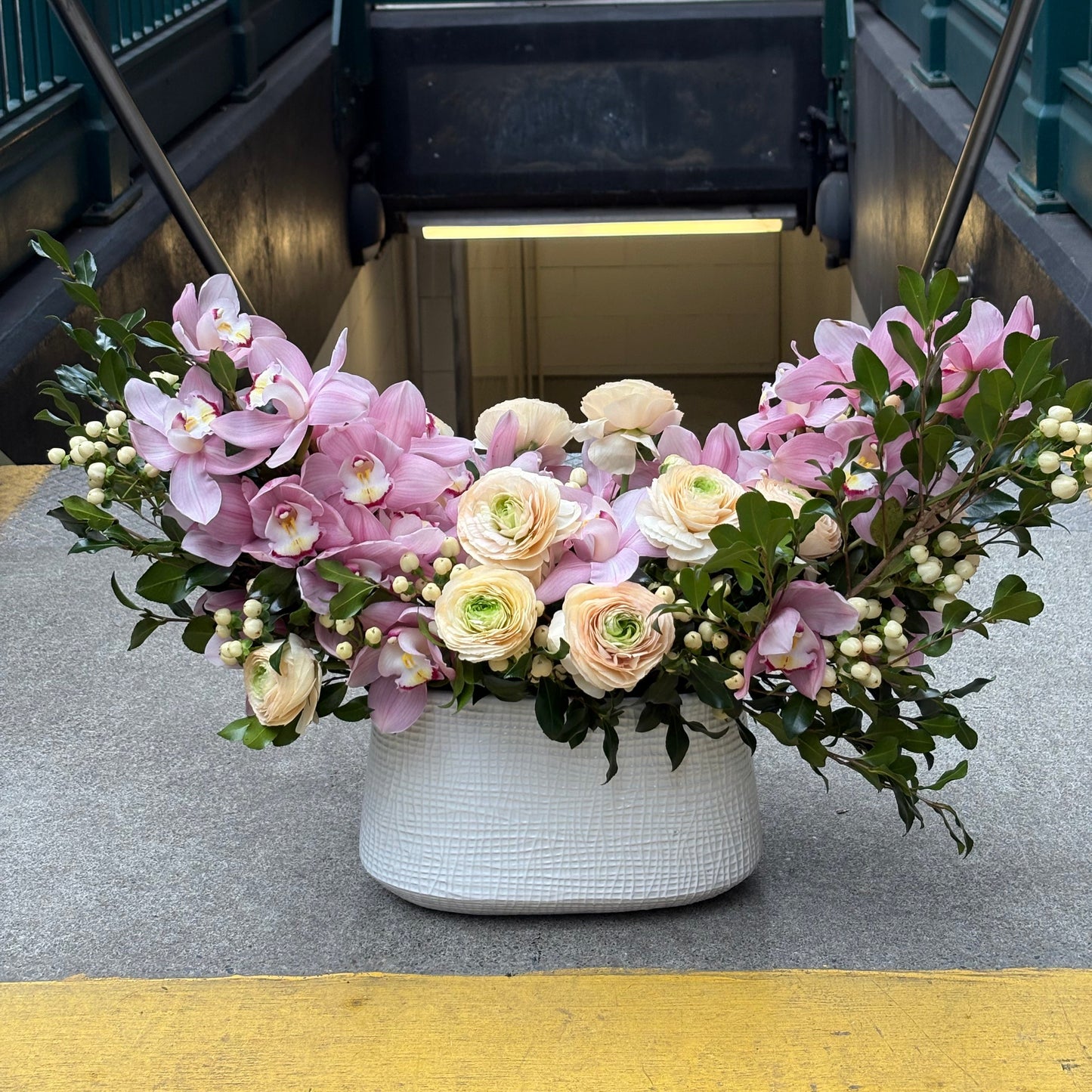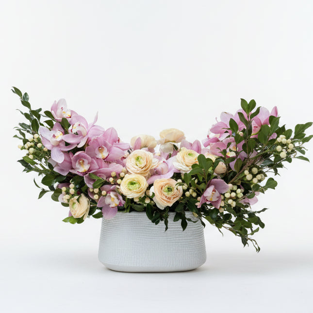 A beautiful, garden-inspired arrangement designed in a white textured ceramic vase, featuring soft pink, peach, and white tones. Showcasing blooms such as cymbidium orchids, ranunculus, roses, and seasonal greenery. Please note that specific blooms may vary based on availability, but the overall design and color palette will remain consistent.